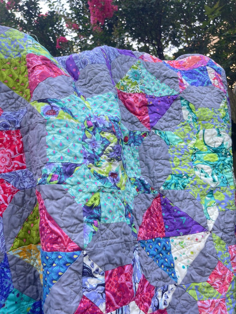 This was my background project quilt for quite some time now. When I saw this Tula Pink Pinkerville fabric line, with its Nessies, Unicorns, I knew this was going to be a treat myself fabric. And (this is where you should be proud of me) it didn’t just stay in a drawer….I actually cut it up and made a quilt to be used and loved!