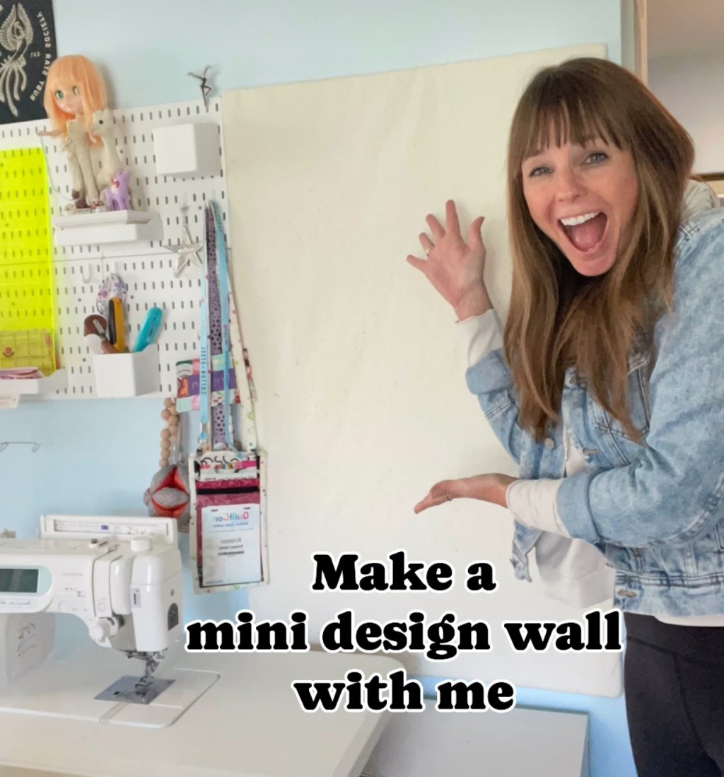 I have a full size design wall across the room, and it works wonderfully! I love being able to put up my finished blocks while a quilt top is in progress. When I got my long arm I had to downsize my sewing/cutting table from a giant dining room table (down from oversized auditorium doors) to a desk. So being as I always had giant sewing tables, I felt like I didn’t have enough room for all my sewing, cutting, block layout needs. That’s when lighting bolt hit, why don’t I take down the calendar above my machine and make a little design wall at my space. It’s large enough to hold a lot, but small enough to not over power the area or need any heavy duty materials.