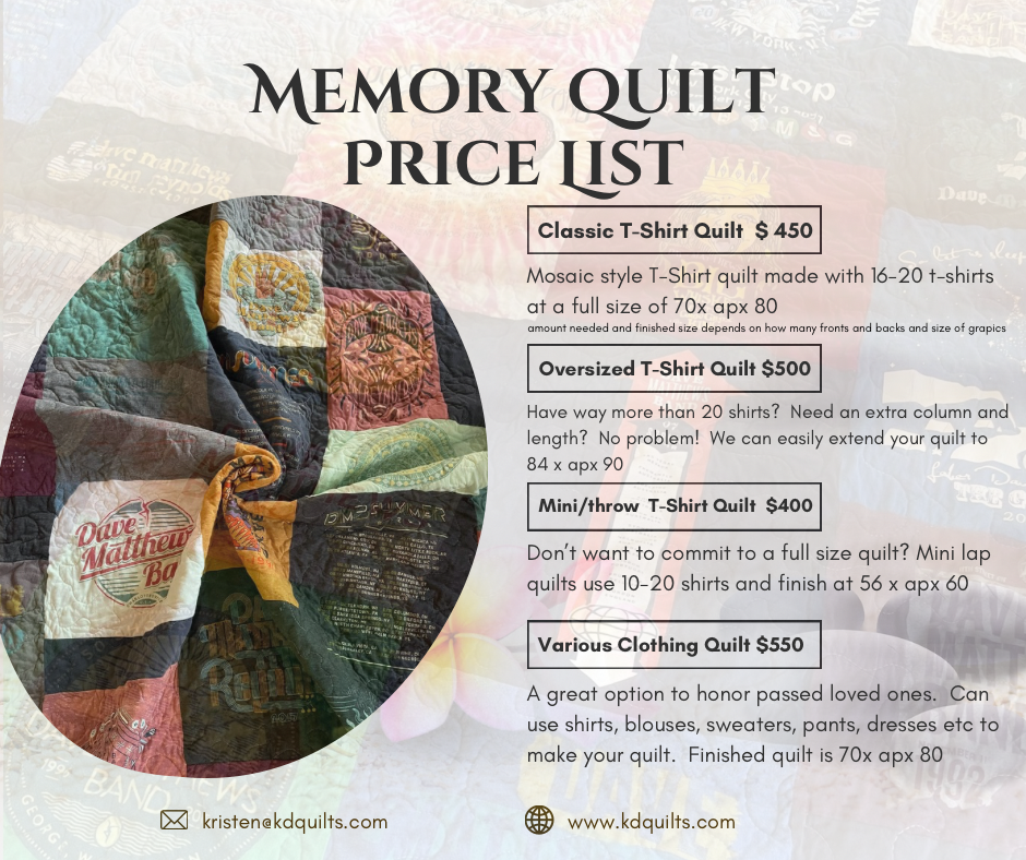 When you’re ready, send me a message letting me know you’d like a memory quilt and your preferred backing color. I’ll then provide the address for you to send your shirts. My usual turnaround time is about 3-6 weeks. Once your quilt is finished, I’ll ship it back to you at no additional cost within the continental US.